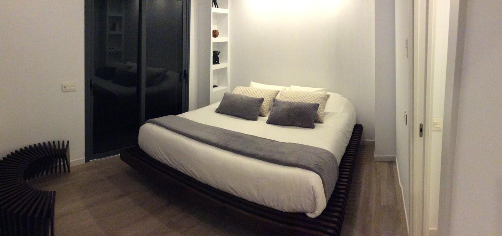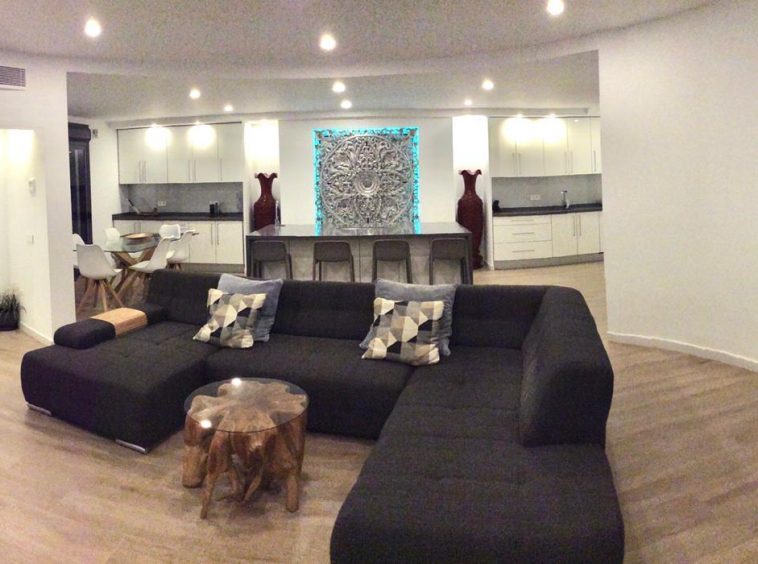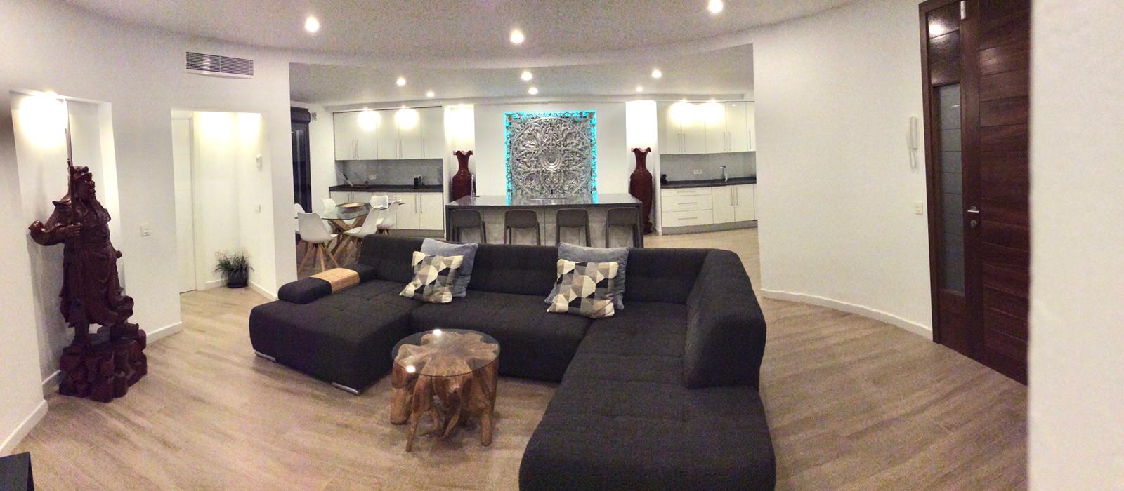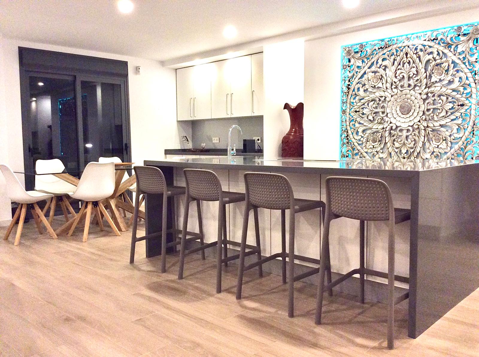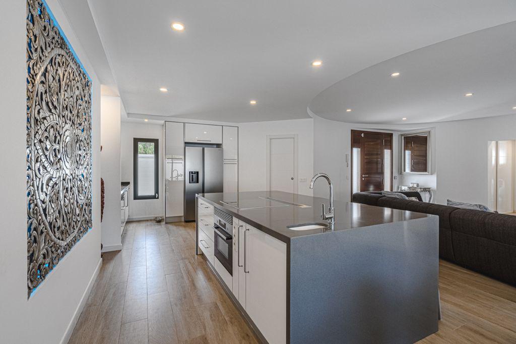 Downstairs: large open space lounge, modern kitchen with silestone countertops, “american”fridge freezer, induction cooker, dishwasher, oven/microwave and lifting extractor fan hidden within the central cooking island. Dining area with glass table for 6 people and access to the outdoor covered patio/breakfast area and floating water feature. 3 double bedrooms (one currently used as office), 2 large bathrooms and separate laundry room with washing machine and tumble-dryer. All bedrooms have direct access to the outside area and the main bedroom has a large walk in closet with lots of storage space. All windows have double glazing and security electric shutters. Every room is fitted with separate built in air conditioning.