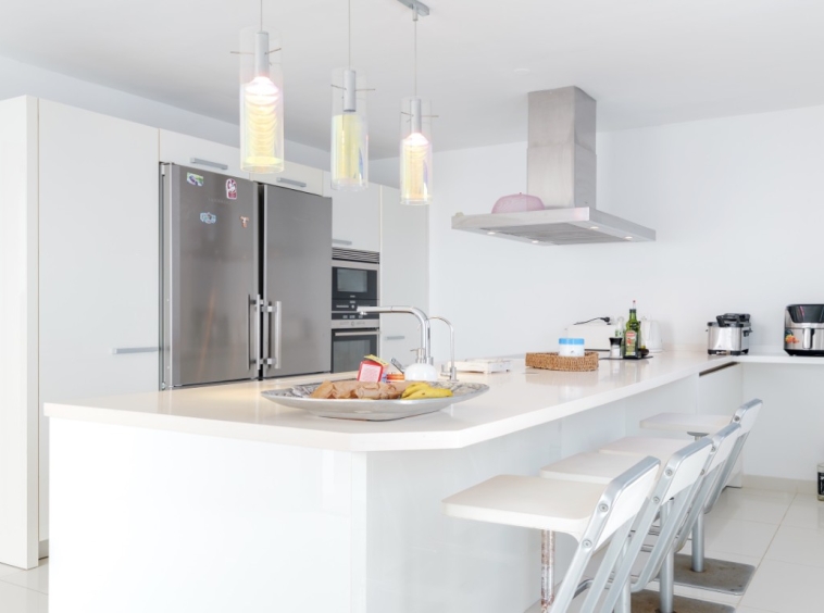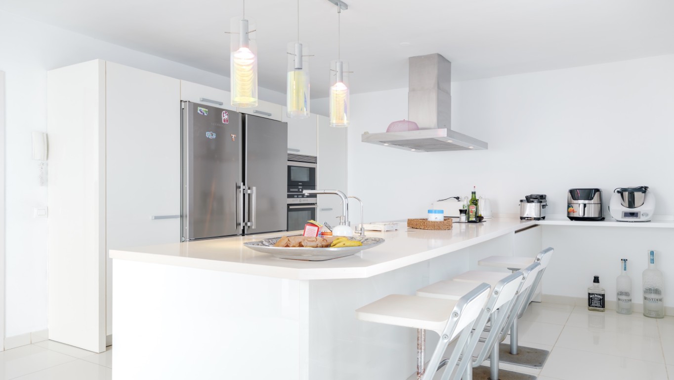 Inside, the villa boasts a large main living room with sea views, a sitting and television area, an office or study with sea views, a guest toilet, and a fully equipped independent kitchen with direct access to a spacious terrace and patio, ideal for al fresco dining.