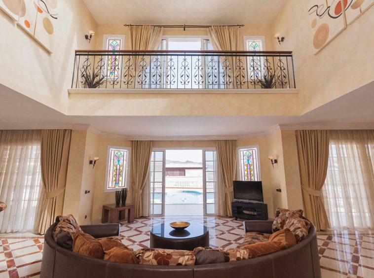 The ground floor comprises a grand entrance hall, spacious living area with double height ceilings, terrace, heated pool and gardens, bedroom suite, independent kitchen.
